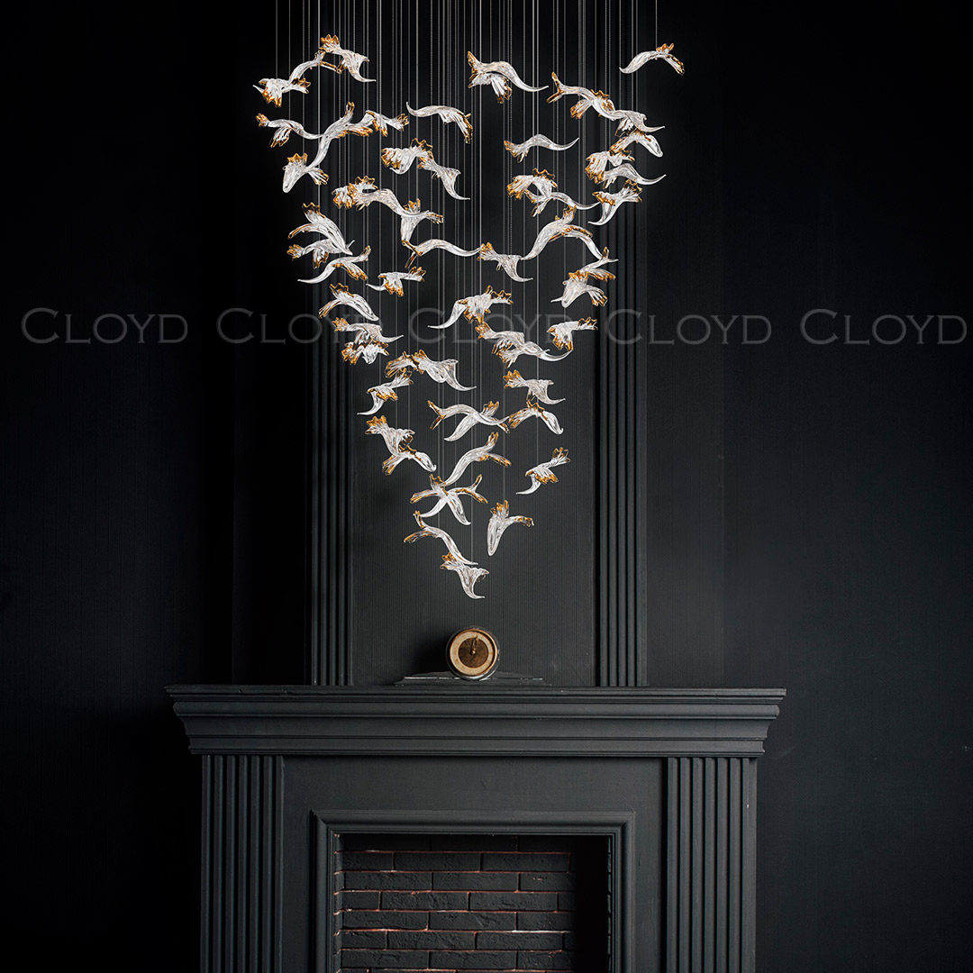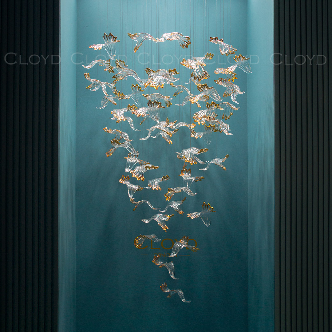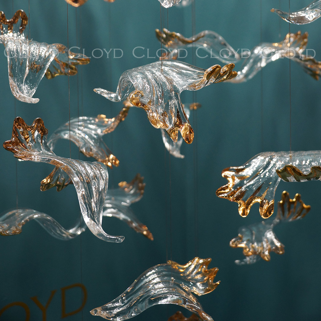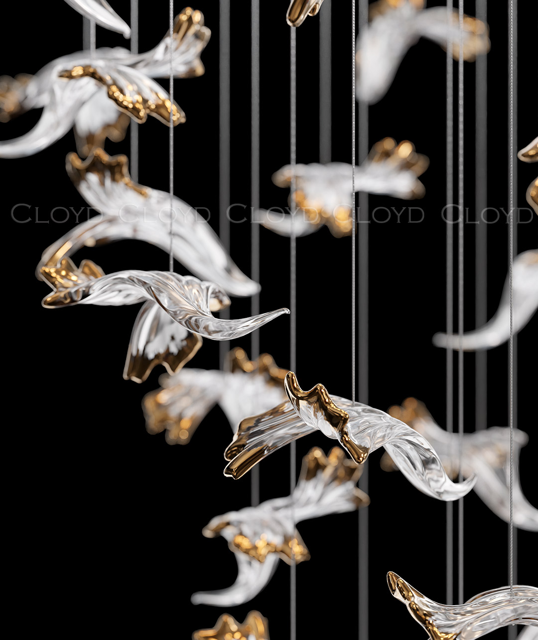 Декоративная композиция Cloyd AERIA 1703 (Клойд Аэрия) S60 / арт.60001, ø: 80 см. высота: 200 см. Без потолочной чаши. Композиция включает в себя: 60 стеклянных элементов (цвет стекла - прозрачный и золото), потолочные крепежи, трос, фиксаторы для стекол и сопроводительную документацию для монтажа.Рекомендуемое количество источников света — 9 шт (не включены в стоимость). Возможны любые изменения размеров и форм под ваш проект.