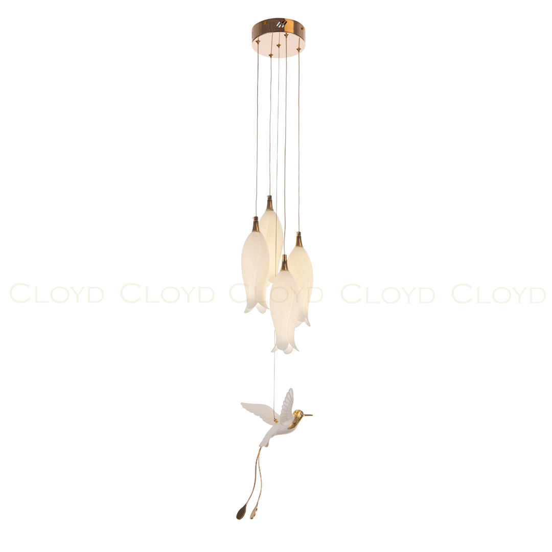 Подвесной светильник Cloyd ARGANA (Клойд Аргана) P4 / арт.11241, ø: 20 см. высота: 150 см, источник света: E14 х 4 шт, цвет металла - золото блестящее. Особенности: керамика высокого качества, птица выполнена из фарфора.Гарантия: 1 год.