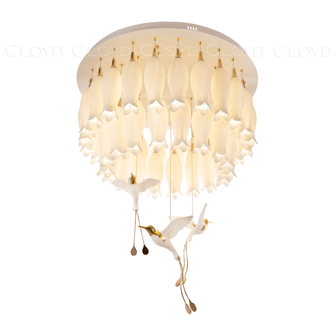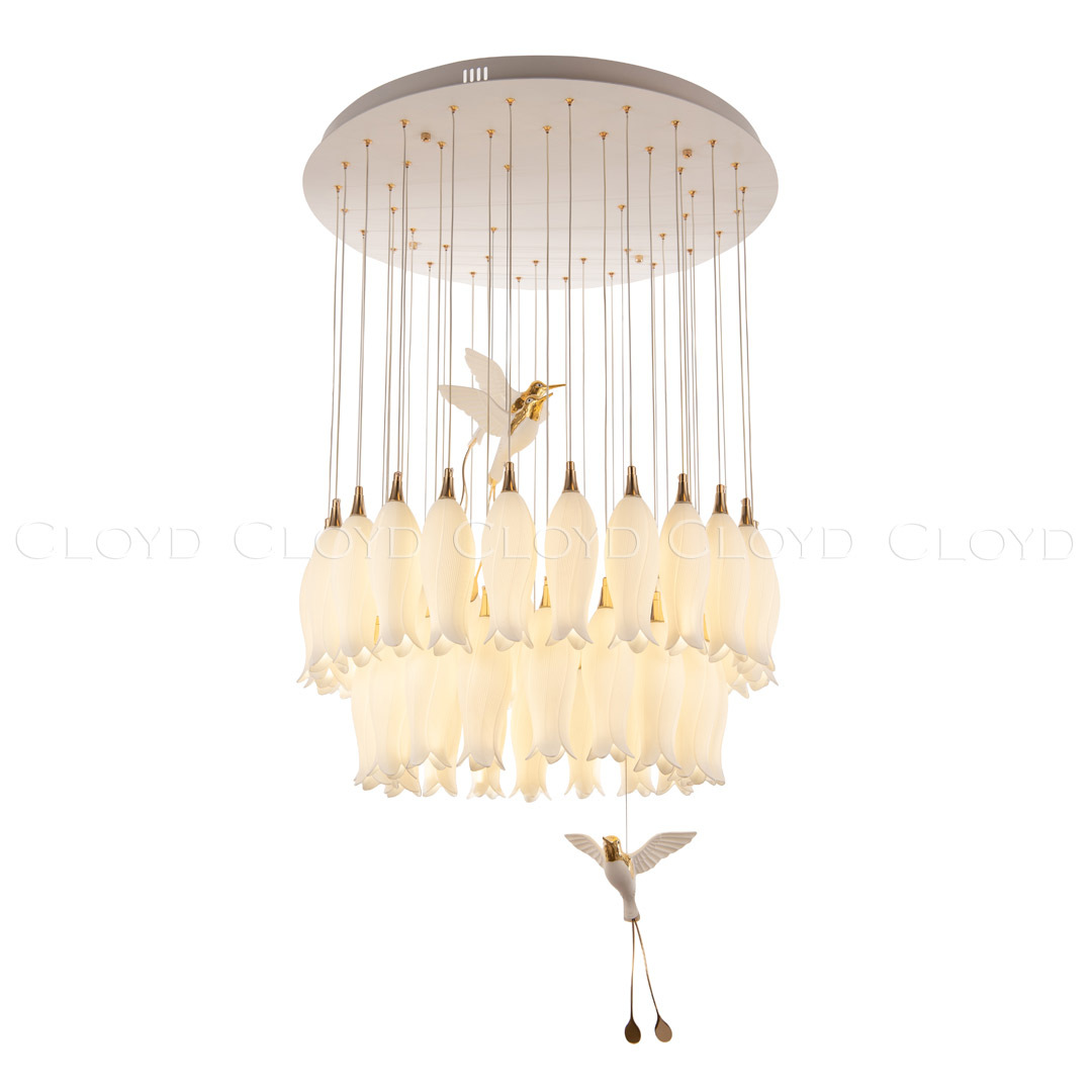 Люстра подвесная Cloyd ARGANA (Клойд Аргана) C42 / арт.11237, ø: 79 см. высота: 150 см, источник света: E14 х 42 шт, цвет металла - белый (окраска). Фурнитура - золото. Особенности: керамика высокого качества, птица выполнена из фарфора.Гарантия: 1 год.