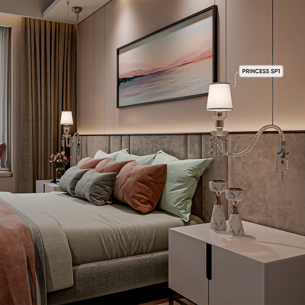 Princess — воплощение очарования и роскоши. Название говорит само за себя, ведь эти светильники действительно завораживают своей красотой. Они могут быть установлены в интерьере как с абажурами, так и без них, создавая уникальную игру света. Хрустальные подвески добавляют изысканности и блеска, делая светильник настоящим украшением комнаты.