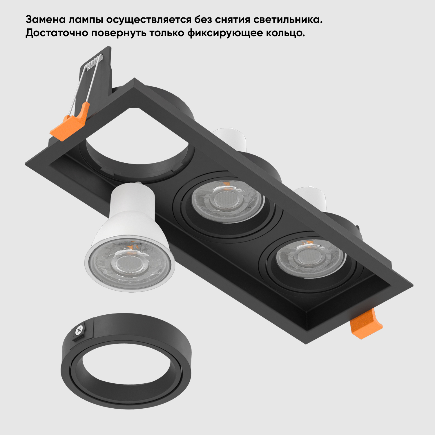 Усовершенственный механизм смены ламп. Светильник не надо доставать из отверстия. Лампа меняется с внешней стороны.