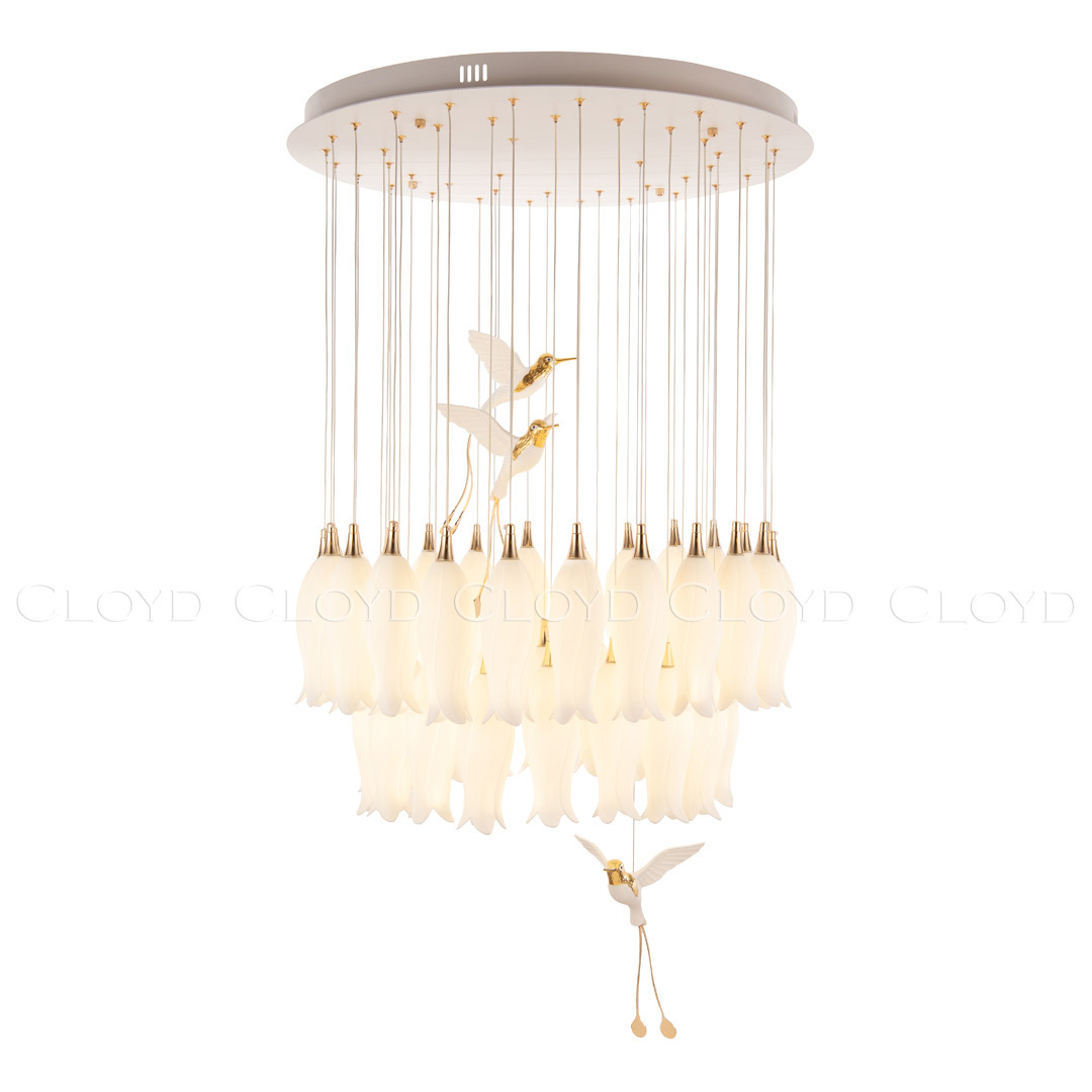Люстра подвесная Cloyd ARGANA (Клойд Аргана) C42 / арт.11237, ø: 79 см. высота: 150 см, источник света: E14 х 42 шт, цвет металла - белый (окраска). Фурнитура - золото. Особенности: керамика высокого качества, птица выполнена из фарфора.Гарантия: 1 год.