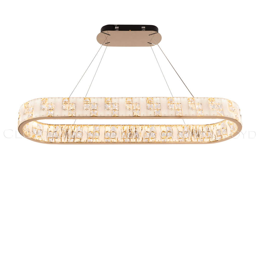 Люстра подвесная Cloyd PERSEFONA (Клойд Персефона) C1 / арт.11229, ширина: 110 см. высота: 10 см глубина: 32 см, источник света: LED 100 Вт (3000 К, теплый свет), цвет металла - золото блестящее. Особенности: алебастр или Облачный Камень - минерал с повышенной светопроницаемостью, хрусталь К9.Гарантия: 1 год.