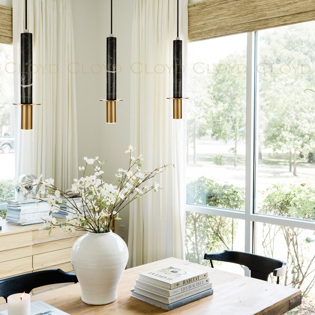 Подвесной светильник Cloyd CLARNET (Клойд Кларнет) P1 / арт.10797, ø: 10 см. высота: 36 см (подвес в комплекте - до 150 см), источник света: GU10 х 1 шт, цвет металла - латунь. Особенности: натуральный мрамор.Гарантия: 1 год.